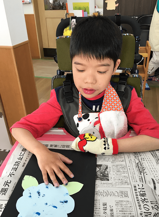こいのぼりの製作に続き、皆でアジサイの製作にも取りかかりました。ピンク色や水色、青色等から好きな色の画用紙を選び、折り紙や絵の具を使って思い思いに模様を付けていきました。指先やスタンプ、筆など模様を付ける方法はさまざま!素敵な作品が仕上がりました。